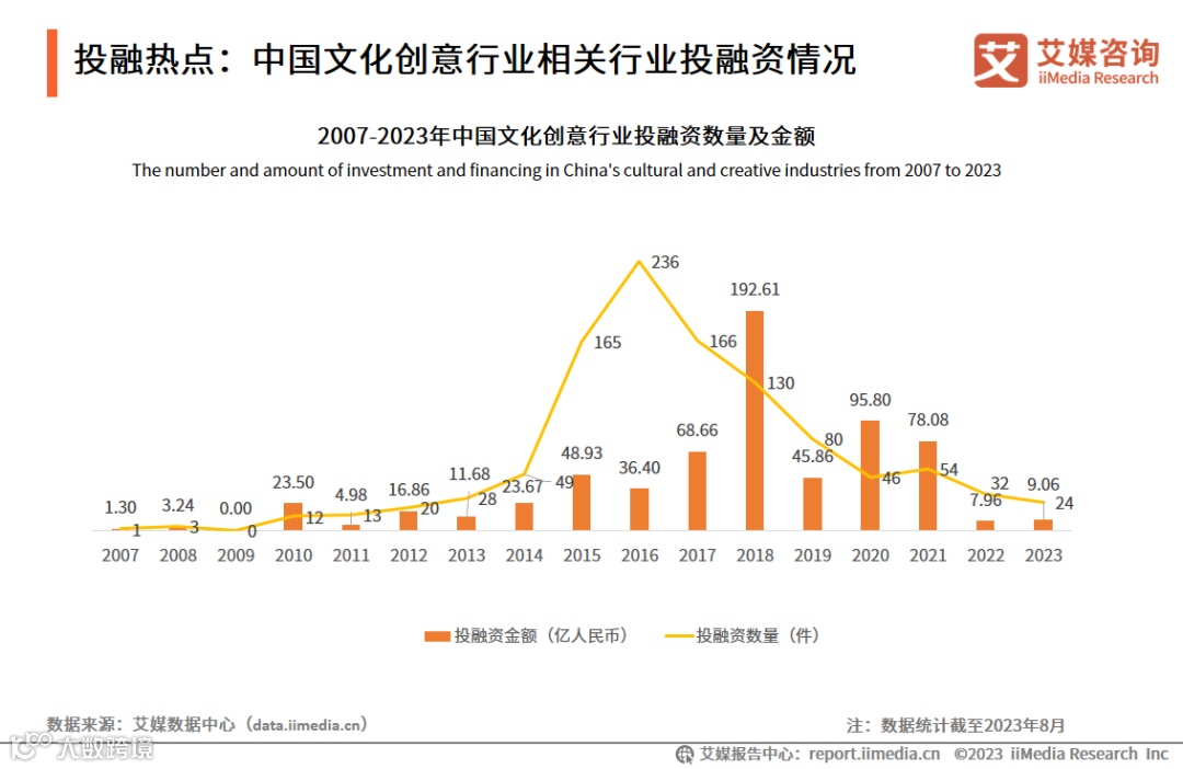 图表8 2007-2023年中国文化创意行业投融资数量及金额
