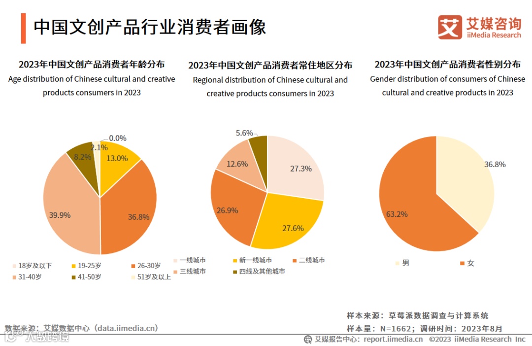 iiMedia Research(艾媒咨询)数据显示,文创产品消费者以女性为主,占比为63.2%,近九成消费者年龄在19-40岁之间,主要常住地区为一线、新一线、二线城市。职业分布中,企业管理者、普通职员、专业人员的消费者占据前三,超六成文创产品消费者为企业白领。