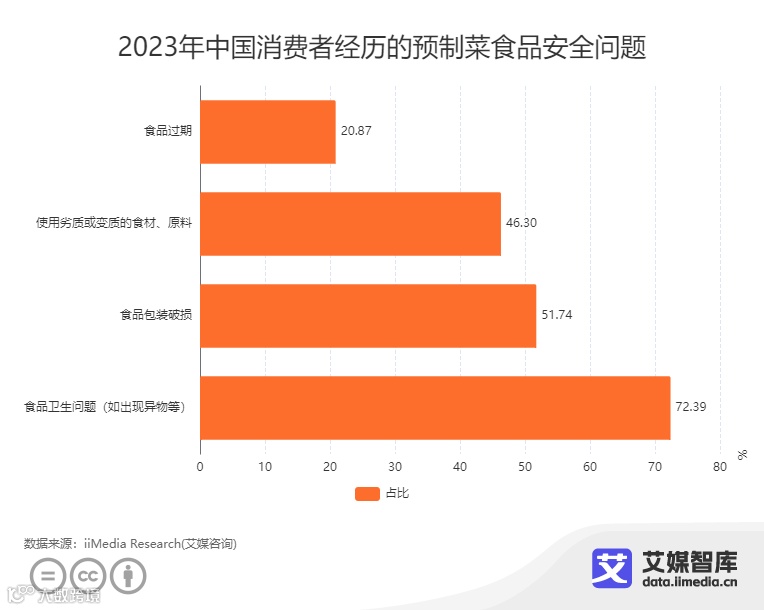 iiMedia Research(艾媒咨询)数据显示,在2023年中国消费者经历的预制菜食品安全问题中,72.39%消费者表示经历过食品卫生问题(如出现异物等),51.74%消费者表示经历过食品包装破损问题,46.30%消费者经历过收到/食用到劣质或变质的食材、原料,20.87%消费者表示经历过食品过期问题。