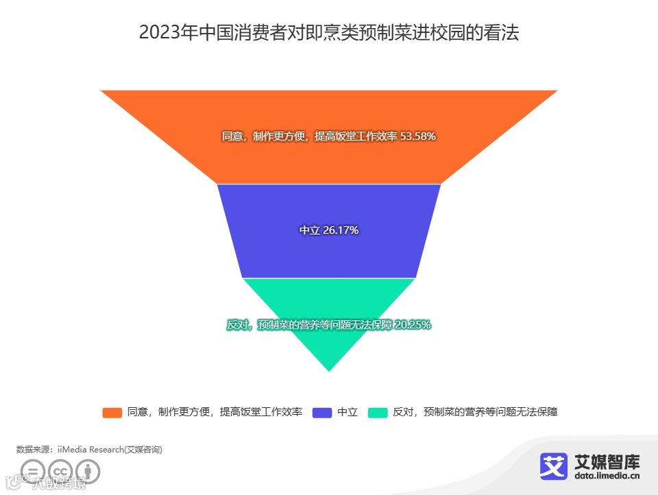 iiMedia Research(艾媒咨询)数据显示,在2023年中国消费者对即烹类预制菜进校园的看法中,53.58%消费者会选择同意;26.17%消费者会选择中立,20.25%消费者会选择反对。相对现制菜,预制菜的营养等问题无法得到保障,也不应成为孩子的主流饮食。