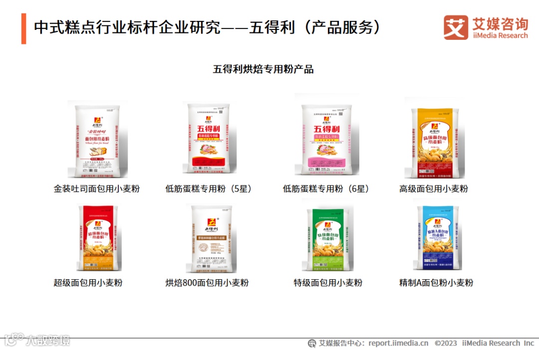 五得利的产品主要分为等级面粉、副产品、等级专用面粉、烘焙专用粉、挂面系列、商超系列等八大系列产品,其中烘焙专用粉包括低筋蛋糕专用粉、高级面包用小麦粉等八大品种。作为中国头部面粉企业,五得利面粉集团以ISO9001为基础,引进国际先进工艺,生产低灰分高精度面粉,不断建立健全质量管理体系。五得利为中式糕点行业中游企业提供丰富的原材料品类,满足中式糕点企业多样化需求。