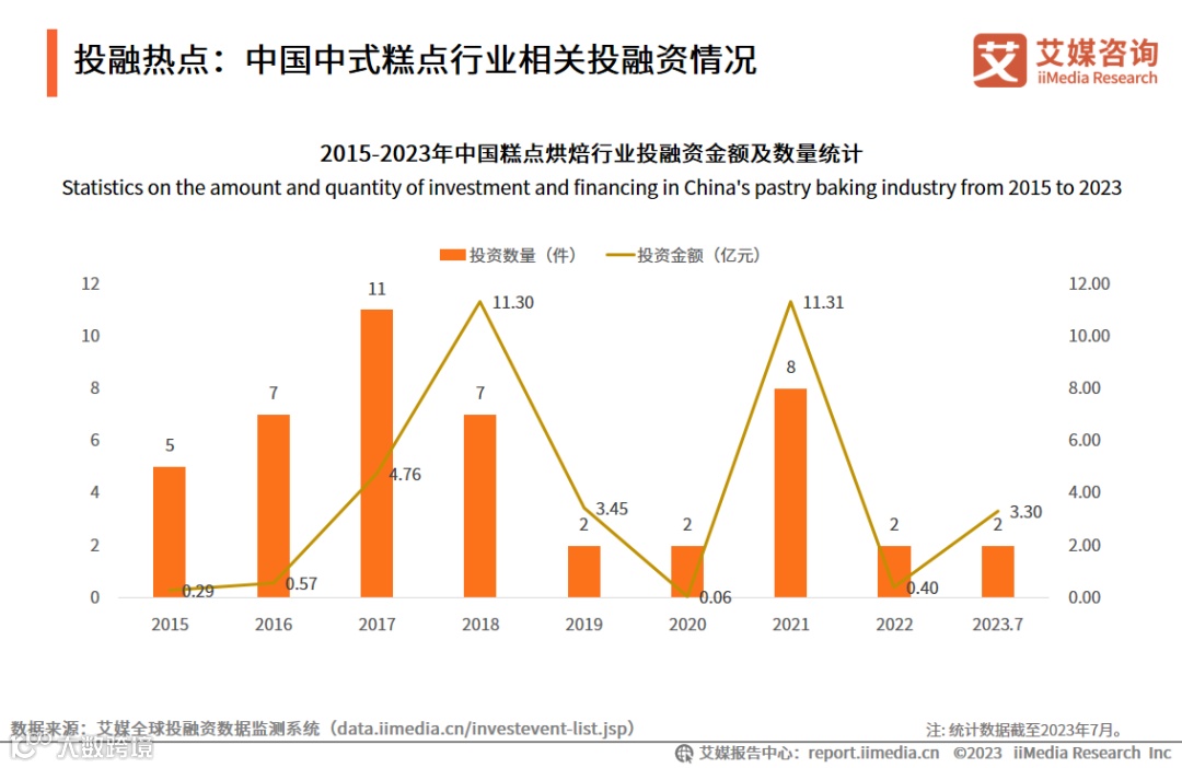 6.2015-2023年中国糕点烘焙行业投融资金额及数量统计