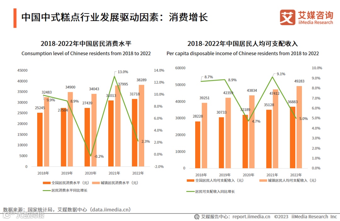 数据显示,中国居民的消费水平呈现逐年上涨的趋势,2022年中国居民消费水平和可支配收入分别达31718元、36883元。艾媒咨询分析师认为,随着居民消费结构的改变和消费水平的提高,作为中国历史悠久、种类繁多的特色食品,中式糕点能够满足消费者对于食品多样化的需求,特别是在特定的传统节日,如春节、中秋节等消费需求更是高涨,传统糕点行业逐渐崛起,承载着中国文化的特殊记忆。