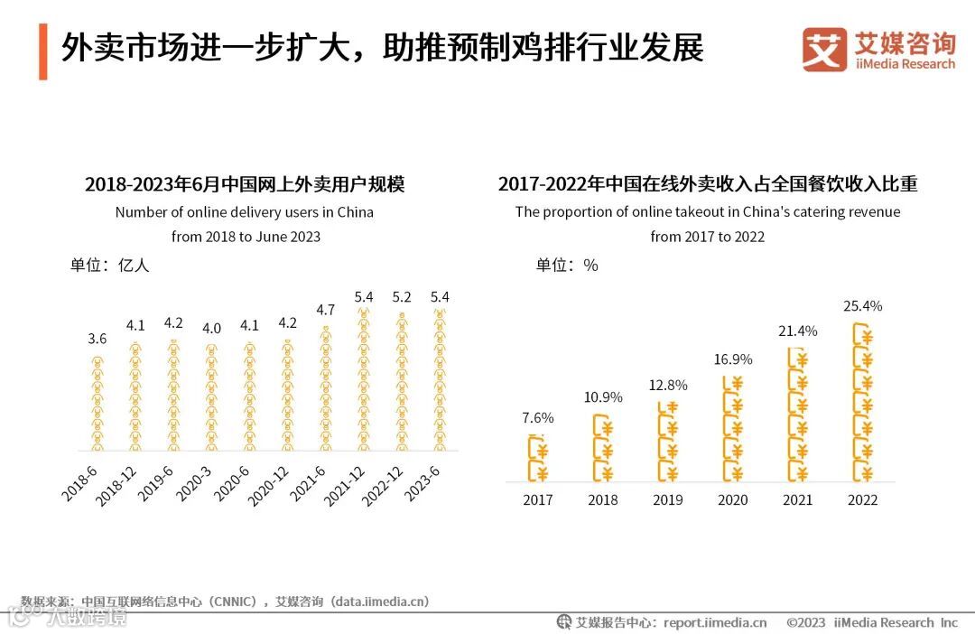 数据显示,截至2023年6月,中国网上外卖用户规模达5.4亿人;2022年中国在线外卖收入的占比增长到餐饮总收入的25.4%。可以看出,中国的网上外卖用户规模呈现上升趋势,在线外卖收入占比每年稳步上升。近年来,餐饮外卖市场快速增长,预制鸡排产品成为外卖餐厅和平台的重要选项之一。随着外卖市场的扩大,预制鸡排市场也将有更多的发展机会。