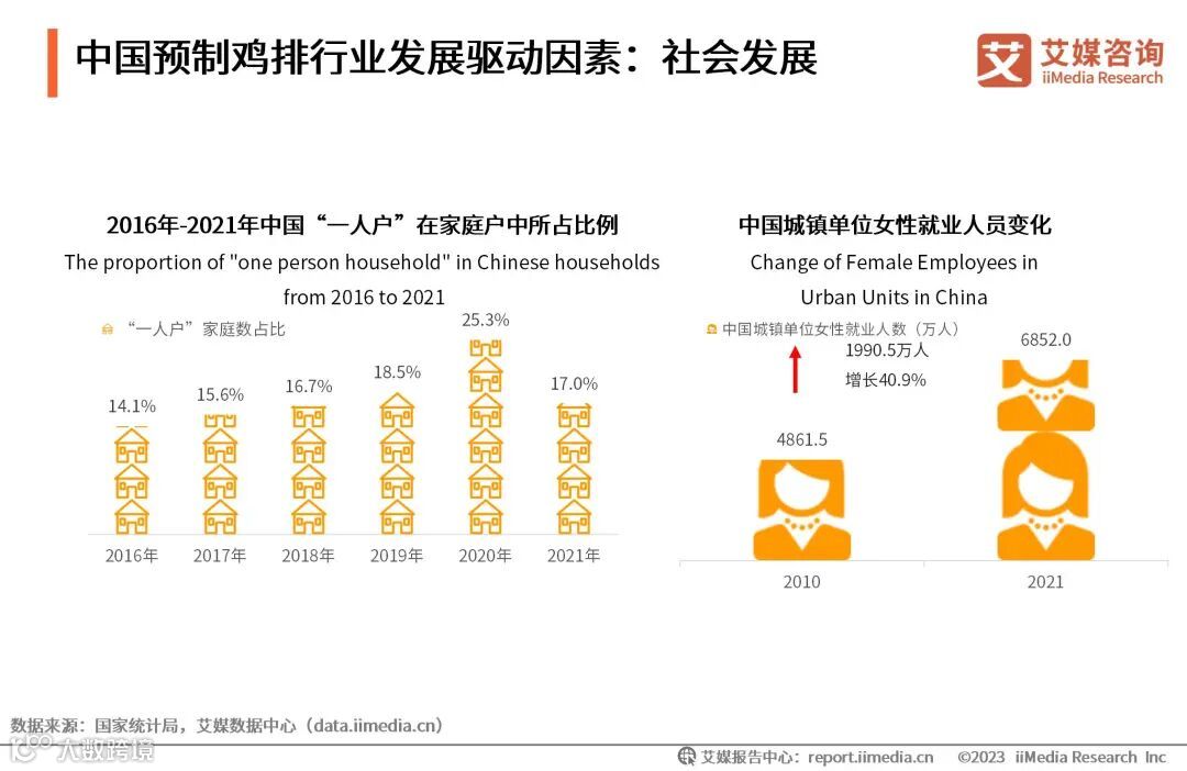 数据显示,2021年中国“一人户”占总家庭户的17.0%,较2020年稍有回落。2021年中国城镇单位女性就业人员达6852.0万人,较2010年增长40.9%。艾媒咨询分析师认为,中国居民婚姻结构、劳动结构发生变化, “一人户”家庭数占据了一定的比例。越来越多女性从全职家庭主妇转变成职场女性,预制鸡排方便快捷,仅需简单烹饪即可食用且适合大众口味,能契合劳动人口的需求,存在较大的市场空间。