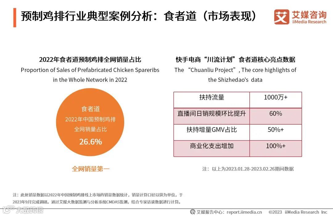 近两年来,食者道发展势头迅猛,尤其在网络销售平台中表现突出。数据显示,2022年,食者道预制鸡排销量全网占比第一,达26.6%。在2023年快手电商38节大促中,食者道的品牌直播间收获了1000万+精准流量扶持,直播间日销规模环比提升60%+,月销GMV超千万。