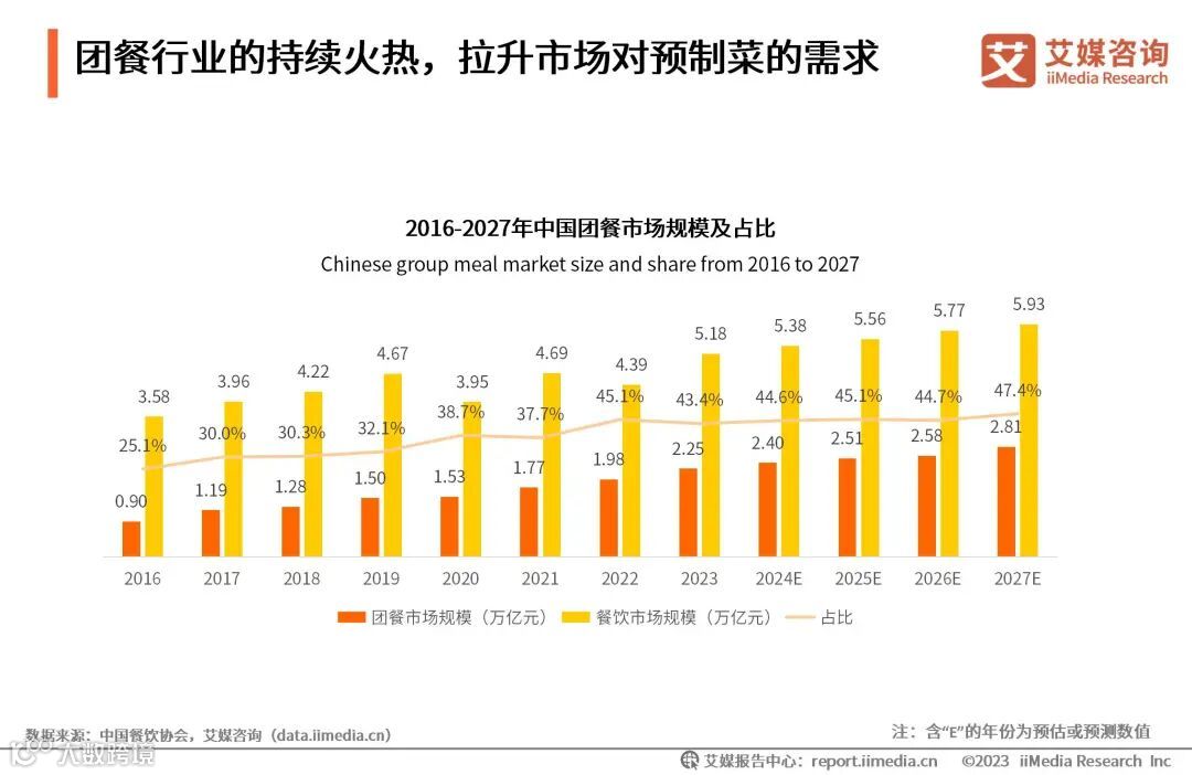 数据显示,中国团餐市场规模持续增长,2023年中国团餐市场规模为2.25万亿元,占餐饮市场规模的43.4%,预计未来团餐市场规模持续上升。艾媒咨询分析师认为,中国团餐企业面临成本高、利润低的问题,催生了对预制菜的需求。团餐供应给学校、机关、军队等,对食品安全、标准化要求较高,预制菜通过严格的质量把控,能有效解决团餐供应难点。