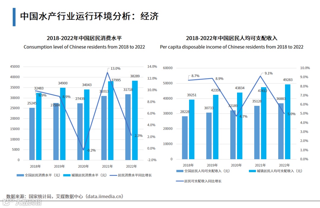 数据显示,中国居民的消费水平呈现逐年上涨的趋势,2022年中国居民消费水平和可支配收入分别达31718元、36883元。艾媒咨询分析师认为,随着居民消费结构的改变和消费水平的提高,水产品已成为居民膳食结构中的重要组成部分,水产消费从“温饱型”向“品质型”转变,海鲜餐饮市场潜力巨大,海水养殖生产已成为拉动中国水产业发展的重要力量。
