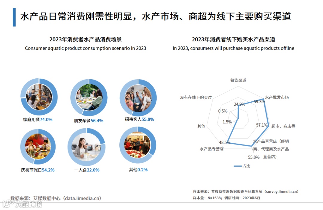 iiMedia Research(艾媒咨询)数据显示,家庭用餐、朋友聚餐、招待客人、庆祝节假日为水产品主要消费场景,其中,74.0%消费者是家庭用餐,水产品日常消费频率高;对于线下购买渠道,消费者倾向于水产批发市场、超市/商店和水产品直营店,分别占比59.3%、57.1%、55.8%。