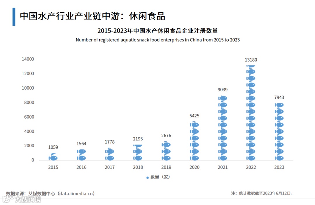 2022年国务院发布的《“十四五”推进农业农村现代化规划》提出建设一批特色农产品标准化生产、加工和仓储物流基地,培育一批特色水产品产业带,中国水产休闲食品市场发展迅速,产品产出持续扩张。随着国家产业政策鼓励水产休闲食品向高技术产品方向发展,国内企业新增投资项目渐多,水产休闲食品企业注册数量逐年递增。数据显示,2022年中国水产休闲食品企业注册数量已达13180家。截至2023年6月12日,水产休闲食品累计企业注册数量为48159家。