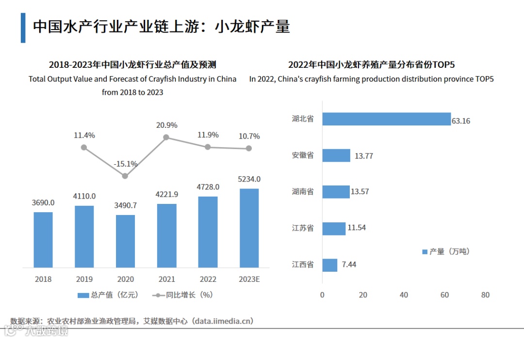数据显示,2022年中国小龙虾产业总产值为4728.0亿元,同比增长11.9%;小龙虾产业正蓬勃发展,2022年小龙虾养殖总产量为112.97万吨,其中湖北省为63.16万吨,位列第一。2023年,在餐饮店堂食得到恢复后,小龙虾作为大众喜食菜品,连锁店、流动摊位、街边小吃店将出现增长,带动小龙虾的菜品多样化、品牌化、连锁化。小龙虾全产业链产值不断提升,成为推进乡村振兴、壮大县域经济的重要特色产业。