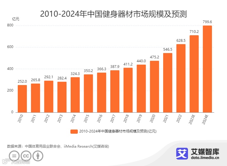 iiMedia Research(艾媒咨询)数据显示,在2010-2024年中国健身器材市场规模及预测中,2022年中国健身器材市场规模为628.5亿元,预计2024年将达到为799.6亿元。中国健身器材的市场规模不断扩大,有望迎来新发展。