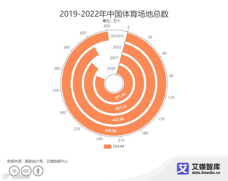 iiMedia Research(艾媒咨询)数据显示,在2019-2022年中国体育场地总数中,2022年中国体育场地总数为422.68万个,2023年上半年中国体育场地总数为450.90万个,环比增长6.67%,预计体育场地总数将再创历史新高。