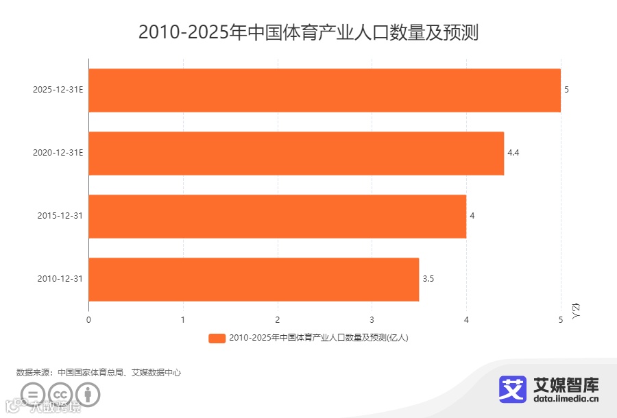 iiMedia Research(艾媒咨询)数据显示,在2010-2025年中国体育产业人口数量及预测中,2020年中国体育产业人口为4.4亿人,预计2025年体育产业人口将达到5亿人。自中国参加奥运会以来,累计获得286块金牌,其中夏季奥运会夺得264块金,冬季奥运会取得22金,体育强国名副其实。