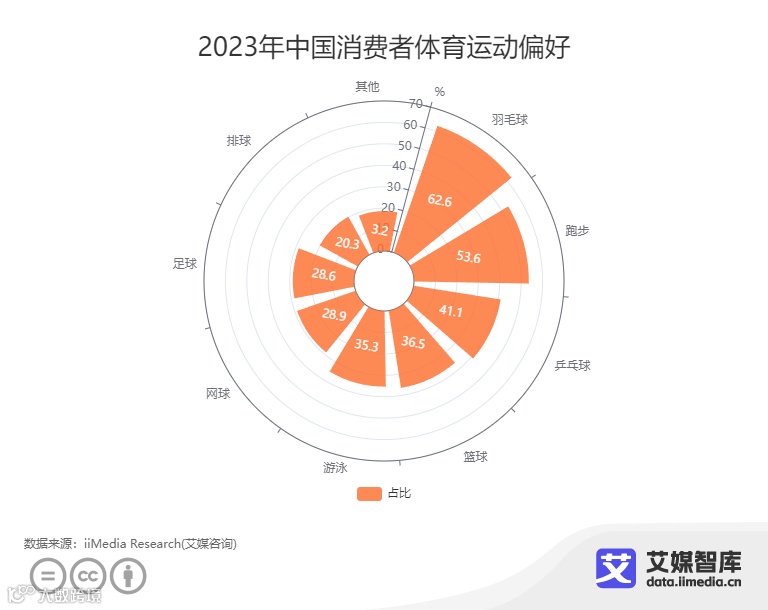 国内体育运动的环境和氛围已经蔚然成风,不仅仅是运动选手,普罗大众也会积极进行体育运动。iiMedia Research(艾媒咨询)数据显示,在2023年中国消费者体育运动偏好中,62.6%的消费者会选择羽毛球,53.6%的消费者会选择跑步,41.1%的消费者会选择乒乓球。