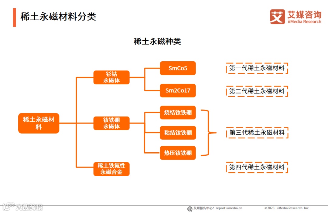 当下普遍使用的是第三代稀土永磁材料为钕铁硼永磁体,在这之前,还有第一代稀土永磁材料——钐钴永磁体(SmCo5)和第二代稀土永磁材料——钐钴永磁体(Sm2Co17)。现在正在研发第四代稀土永磁材料——稀土铁氮性永磁合金。