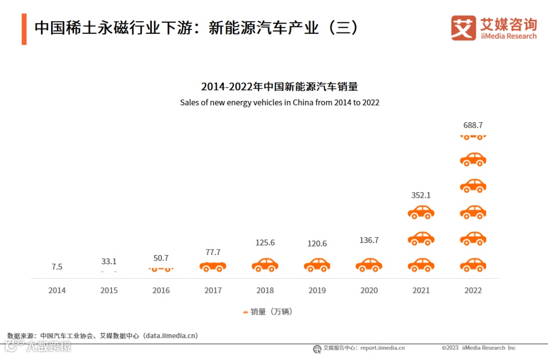 数据显示,2022年中国新能源汽车销量达688.7万辆。艾媒咨询分析师认为,近年来随着新能源汽车技术也在不断提升,市场需求得到释放,稀土永磁材料作为新能源汽车电池制造重要的原材料,其需求也不断增加。