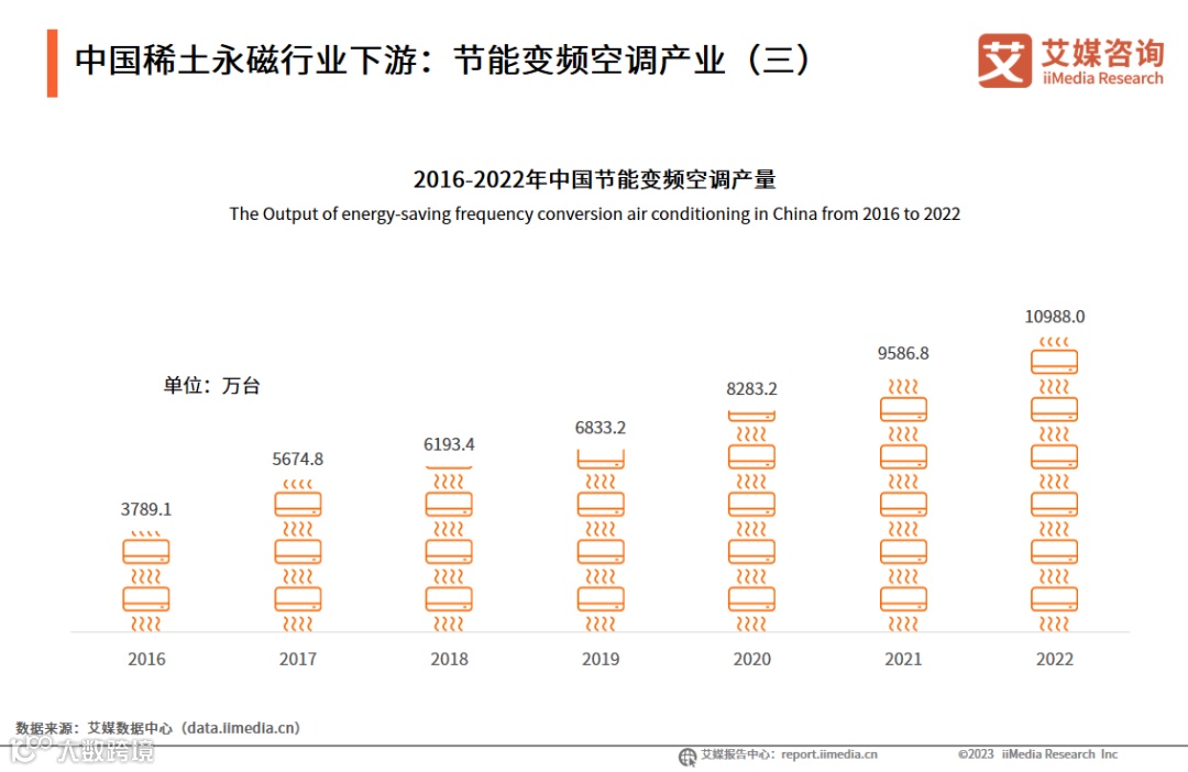数据显示,2021年中国节能变频空调产量达9586.8万台。艾媒咨询分析师认为,近年来随着双碳目标、空调新国标的制定,节能变频空调的需求在不断增多。稀土永磁材料作为节能变频空调压缩机制造的重要原材料,其需求也不断增加。