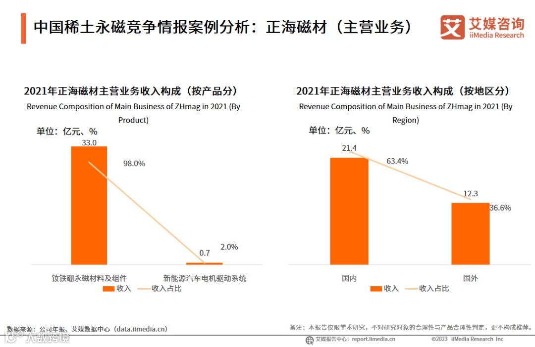 正海磁材的主营业务是高端稀土永磁材料及元器件的研发和制造。根据2021年正海磁材公布的年报数据显示,其钕铁硼永磁材料及组件收入为33.0亿元,占总收入的98.0%;其业务国内与国外均有涉及,国内业务收入占比为63.4%。