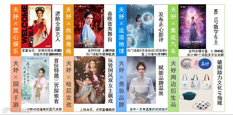 随着虚拟偶像在广告、直播领域的应用,国内互联网巨头都开始将虚拟偶像作为营销的手段,众多游戏公司、技术公司和社交娱乐公司纷纷入局,推出各式虚拟偶像。定位“虚拟人”的科技文娱公司元圆科技推出了首个文化出海的国风虚拟数字人“天妤”。将壁画、飞天等传统文化元素和现代技术融合,独特的国风人物设定,精美的人物形象使“天妤”一出道便广受好评。目前,天妤全网粉丝超550w,视频播放量超4亿,抖音点赞量近3000w,相关话题播放量破9亿。