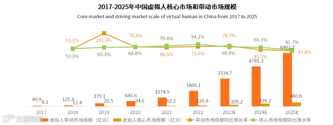 iiMedia Research(艾媒咨询)数据显示,2022年中国虚拟人核心市场规模为120.8亿元,预计2025年将达到480.6亿元;2022年虚拟人带动周边市场规模为1866.1亿元,预计2025年为6402.7亿元。艾媒咨询分析师认为,虚拟人在内容和周边产品产出方面有着较强的可塑性,能根据时代潮流发展不断开发新的爆点,行业增长的延续性较强,未来一段时间内都将保持稳定增长态势。