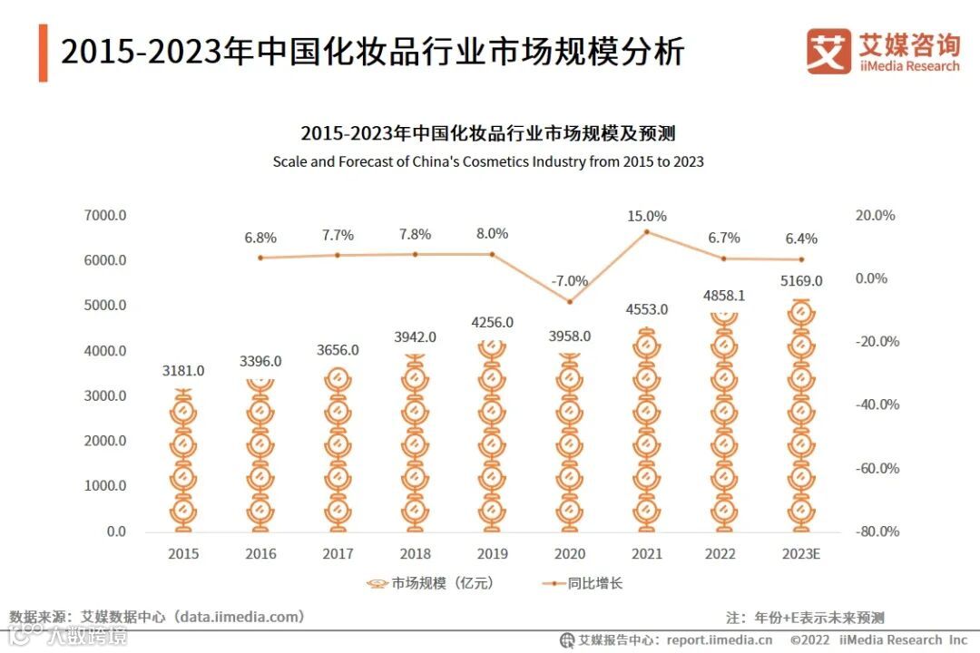 iiMedia Research(艾媒咨询)数据显示,2022年中国化妆品行业市场规模达4858亿元,预计2023年可突破5100亿元。[2]