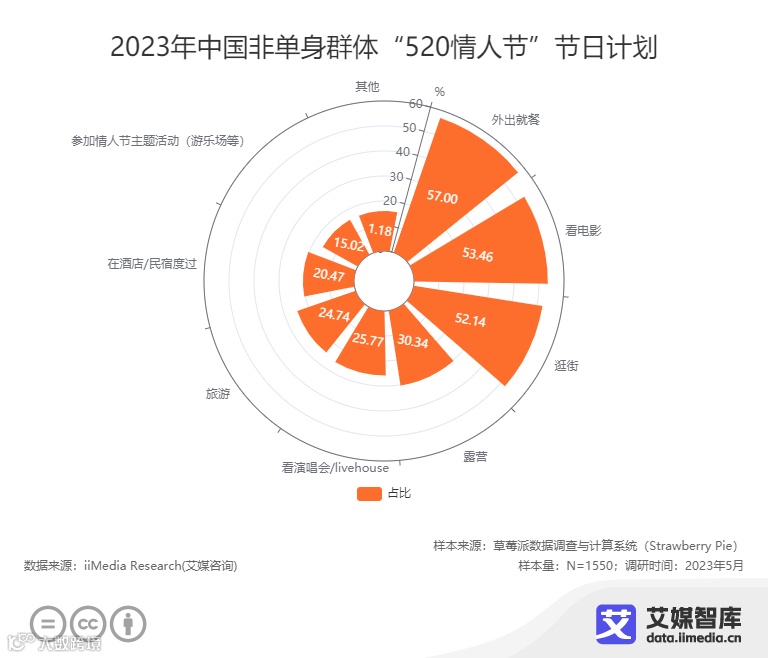 “520”正逢周末,为计划共度情人节的情侣们提供了更多的出行选择。据调查数据显示,有57.00%的消费者选择外出就餐,有53.46%和52.14%的消费者选择看电影、逛街,30.34%的消费者选择露营,这些娱乐方式不仅仅是为了共度情人节,也是在周末休闲放松的绝佳选择。