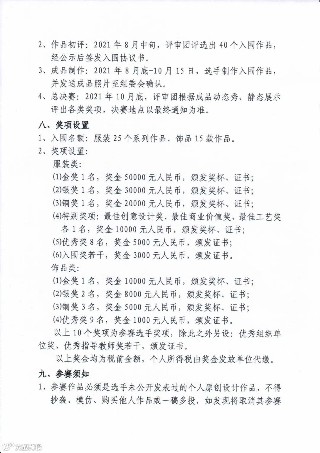 ⑹入围后制作成品所需材料、加工均由选手自行准备,组委会对“服装”入围作品给予补助。不得出现仿真皮草,发现后将取消其参赛资格并且补助全额退回。