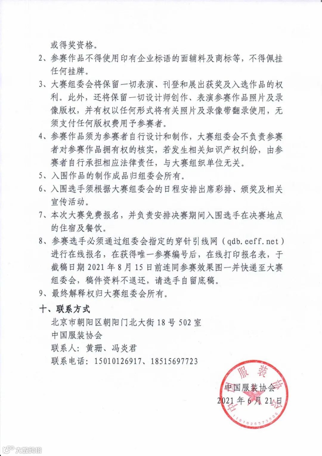 8、参赛选手必须通过组委会指定的穿针引线网(qdb.eeff.net)进行在线报名,在获得唯一参赛编号后,在线打印报名表,于截稿日期2021年8月15日前连同参赛效果图一并快递至大赛组委会,稿件资料不退还,请选手自留底稿。