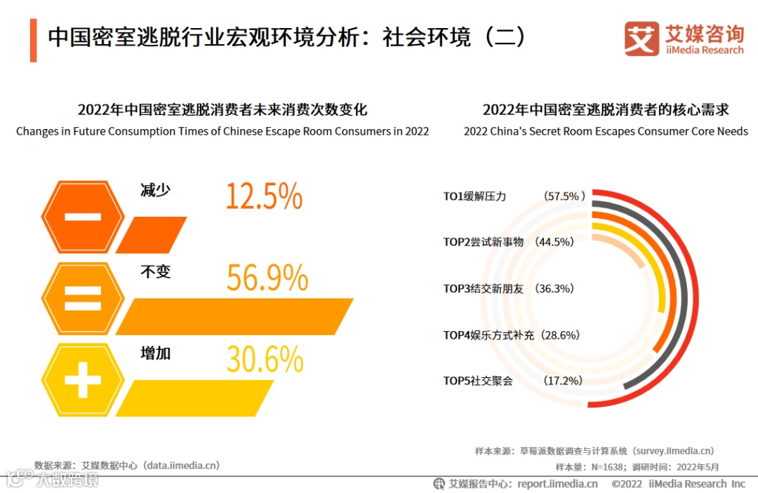 数据显示,中国密室逃脱消费者未来消费次数减少的仅占12.5%,而不变的消费者占56.9%,增加的占30.6%。消费者体验密室逃脱的消费者核心需求为:缓解压力(57.5%)、尝试新鲜事物(44.5%)。密室逃脱消费者消费意愿的强烈,长期利好行业发展。