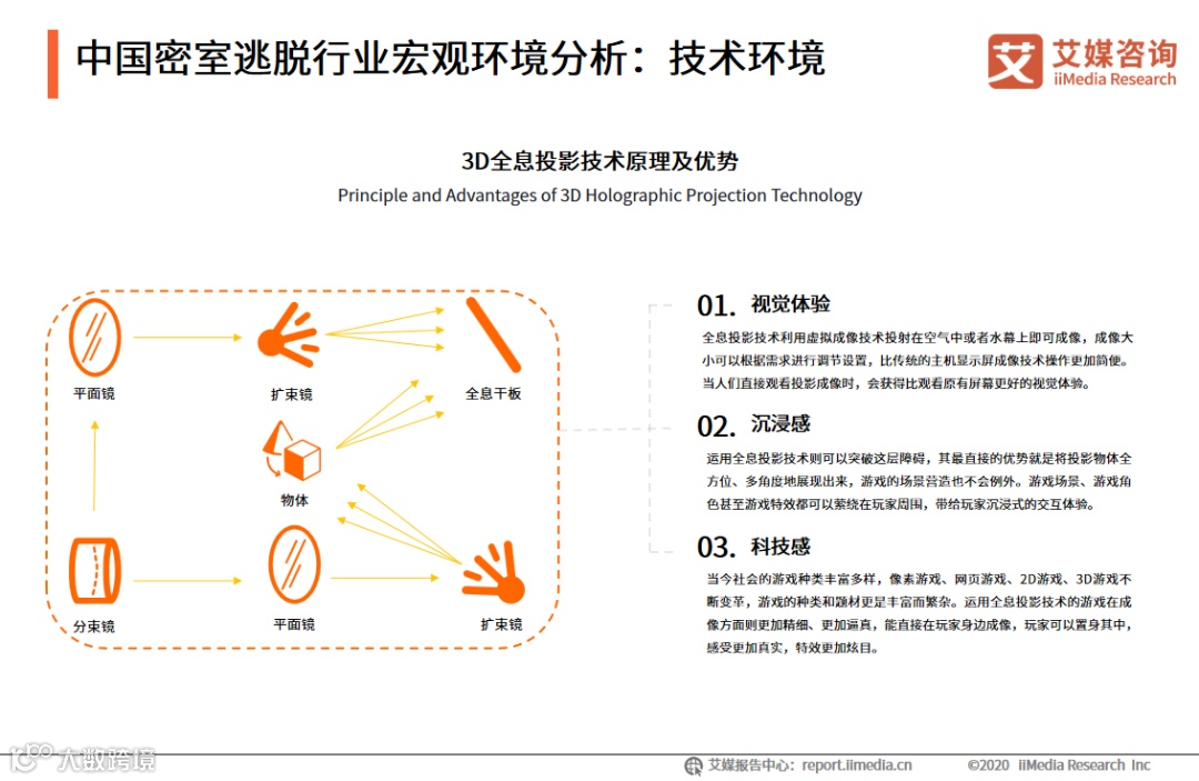 艾媒咨询分析师认为,随着科技的发展,现代密室逃脱多利用现代光学、VR、自动控制等技术,通过模拟各种视觉、听觉、触觉的刺激,为玩家营造出惊吓感与沉浸感。
