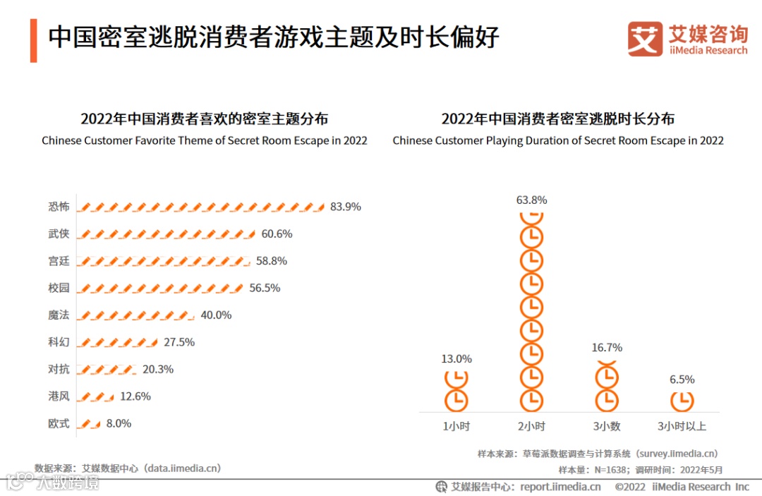 调研数据显示,恐怖型的密室主题最受中国消费者的欢迎,占比高达83.9%,其次是武侠型和宫廷型,分别占比60.6%和58.8%;而较受消费者青睐的游戏时长是2个小时左右。