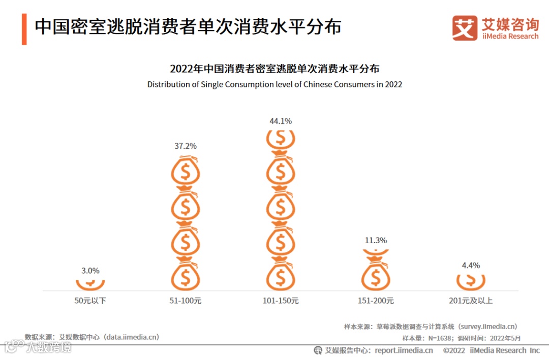 调研数据显示,目前国内的密室逃脱单次消费主要分布在51-150元之间,占比超过80%,单次消费金额200元以上的密室相对较少,仅占4.4%。