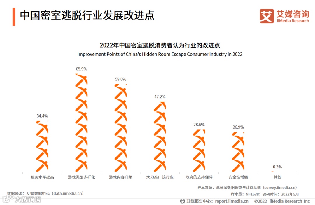 调研数据显示,有65.9%的消费者认为密室逃脱的游戏类型应该更多样化,59.0%的消费者认为密室逃脱的游戏内容需要升级。