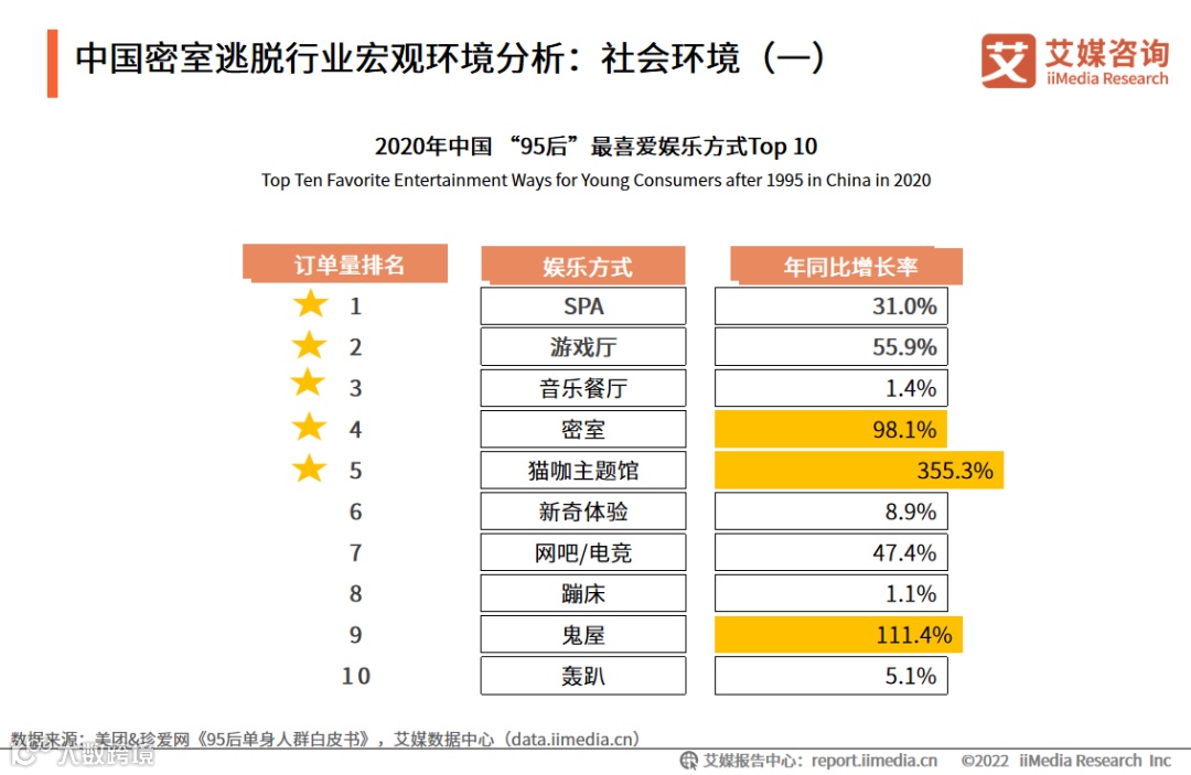 作为一种新兴的休闲娱乐方式,密室逃脱深受年轻一代消费者的喜爱。数据显示,在2020年中国“95后” 最喜爱的新兴娱乐方式中,密室逃脱排名第四,订单量的年同比增长率达到98.1%。