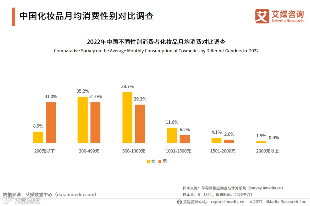 图表38 2022年中国不同性别消费者化妆品月均消费对比调查