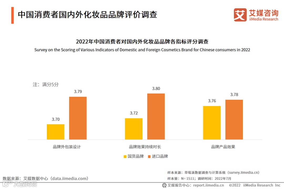 图表39 2022年中国消费者对国内外化妆品品牌各指标评分调查