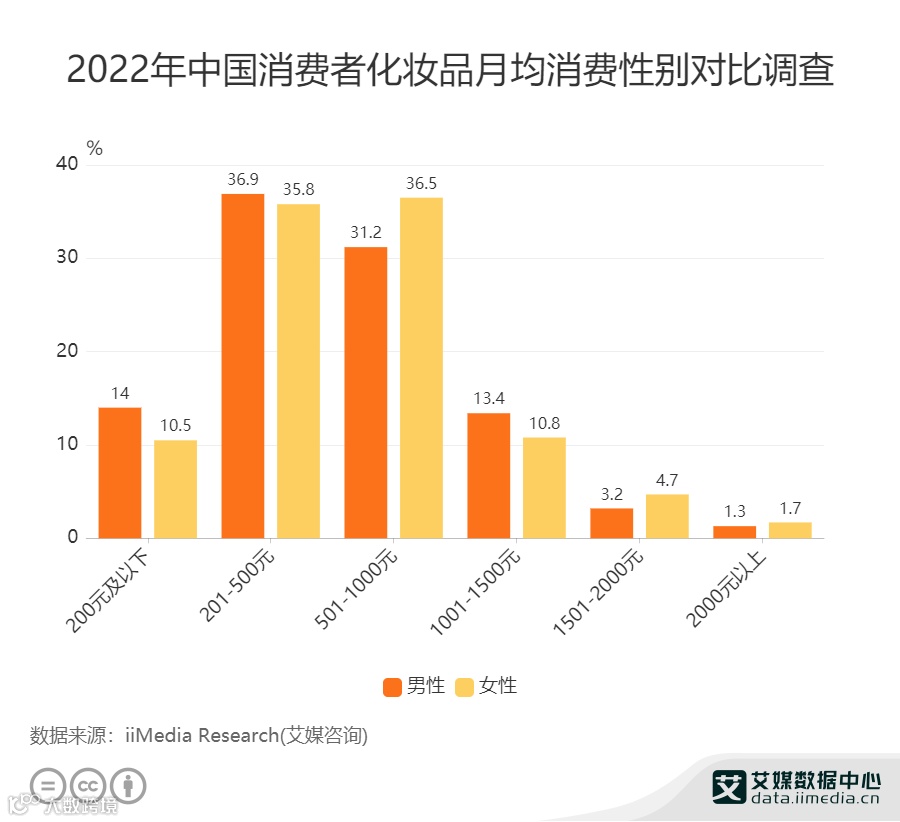 艾媒咨询数据显示,在2022年中国消费者化妆品月均消费调研中,男性与女性在化妆品月均消费上差别不大,甚至在个别消费区间,男性的月均消费超过女性。可见,男性对于化妆品的需求不亚于女性,为“美”花起钱来毫不手软。