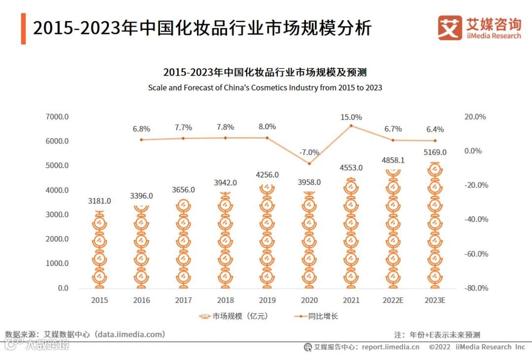 艾媒咨询数据显示,2021年中国化妆品行业市场规模达4553亿元,同比增长15%,基本恢复至疫情前水平。在国民可支配收入不断提升以及审美意识增强、关注高颜值等因素驱动下,国内化妆品消费将继续攀升,预估2023年市场规模将突破5000亿元。