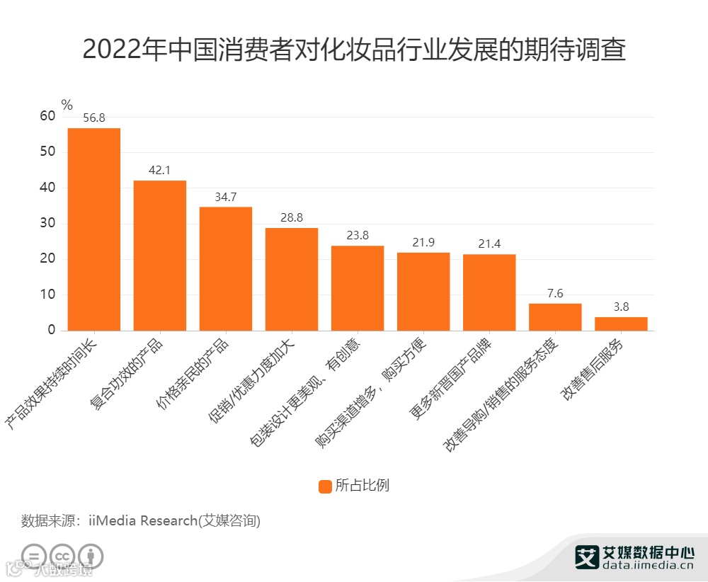 调研数据也显示,2022年,中国消费者对化妆品行业发展最期待的是产品效果持续时间延长(56.8%),其次分别是更多复合功效的产品(42.1%)以及更多价格亲民的产品(34.7%)。艾媒咨询分析师认为,相比于价格和促销,消费者更看重产品质量,效果优良且多元的产品将赋予品牌新的增长空间。