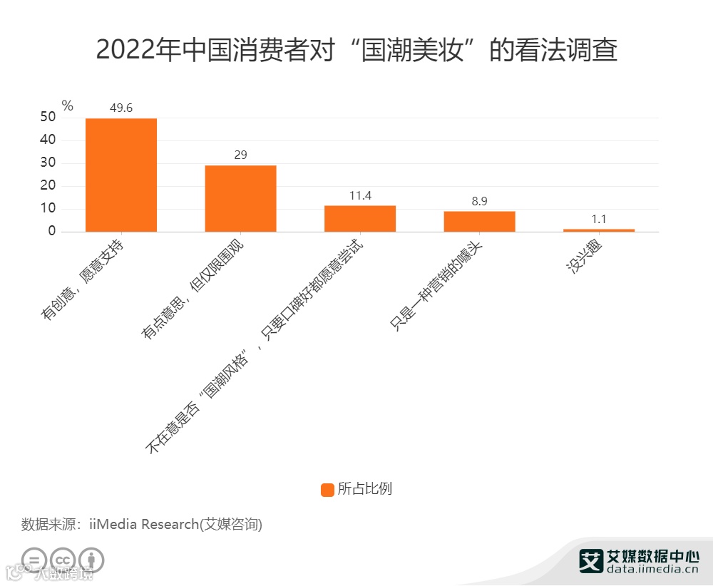 随着中国经济稳步发展,以及新一代消费者文化自信的快速提高,中国品牌影响力不断扩大,国货美妆品牌乘“国潮之风”崛起,受到越来越多消费者的青睐。调研数据显示,2022年,近五成受访者表示“国潮美妆”有创意,并愿意支持其发展,近三成受访者认为“国潮美妆”发展路线有意思,但仍处于观望阶段。