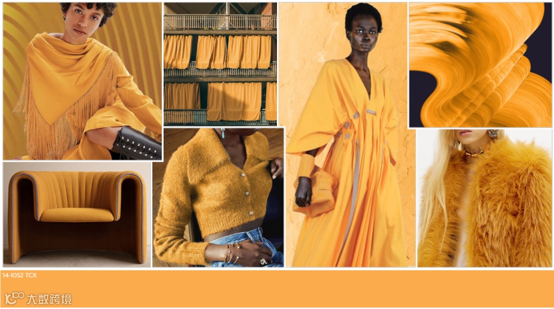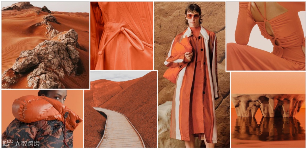 蜜橘色:是充满活力,温暖和引人注目的,天气还持续炎热的秋天。蜜橘色与户外有着密切的联系,它将一种充满活力的情绪带回了时代精神。或者,这个暖色可以作为一个红色的替代色,这季秋冬设计中我们熟悉的礼服,正借蜜橘色一个温暖的存在。考虑到它的户外根源,蜜橘色这个红色色调在合成材料如尼龙和聚乙烯的实用外观上更受青睐。本季蜜橘色建议使用于外套,羽绒服、针织(连帽衫)、毛衣等单品设计中。