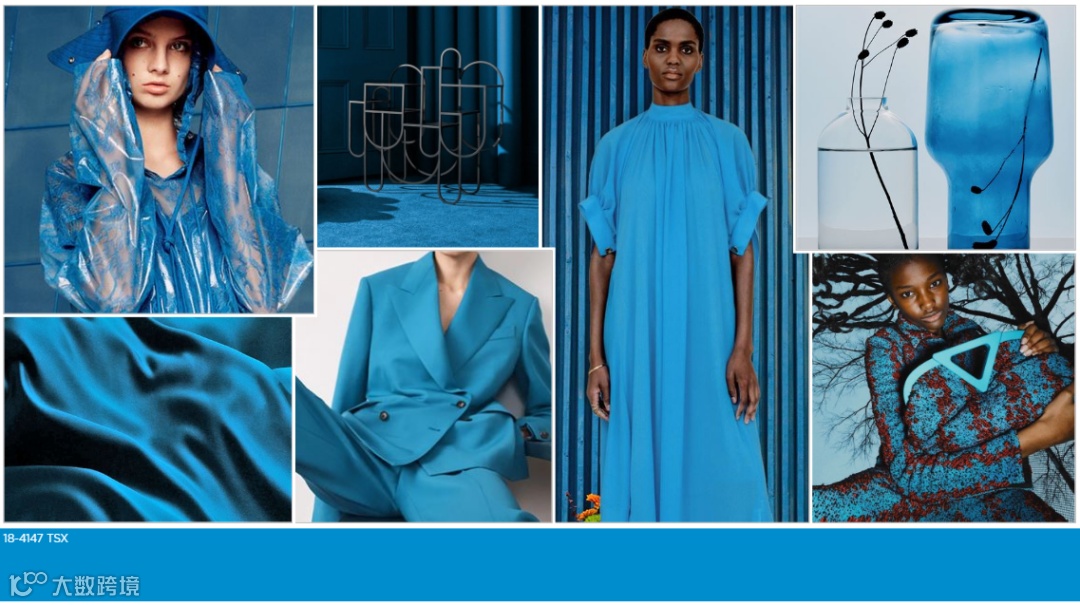 默蝶蓝:根据我们趋势TREND 早期的分类数据分析,加上对围绕水和冰的环境对话的跟踪,一个新兴的“蓝色浪潮”即将风靡,因为蓝色从其他颜色家族手中抢占了可观的市场份额。默蝶蓝与我们的文化情感色彩互动联系在一起,它代表了一个新的开始,将我们淹没在一个令人耳目一新的逃避现实和活力的水池中——自然和数码之间的互联。默蝶蓝尤其适合应用于合成材料,如尼龙,聚酯等面料,捕捉其充满活力的色彩质感,而光滑和反光等属性提供了发光效果。无论是坚实材料的应用还是印花面料都特别青睐默蝶蓝。外套、连衣裙、西装等设计用这个色彩极具魅力.