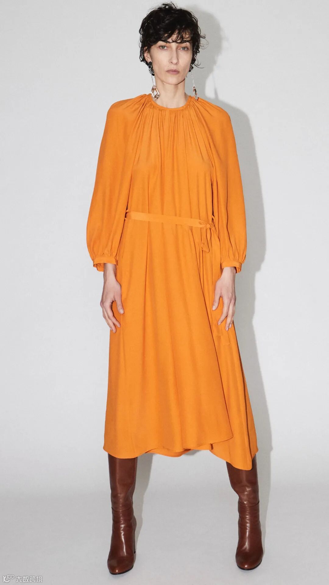 金橘色:可借鉴近两季流行的黄色在女装商业上的成功案例。金橘色因其活力而展现出提升心情的特质,很适合秋装,色彩饱和度的更新在季节性的调色板中散发出低调的优雅。这个理想的色彩应用取代了色彩和图案的最大限度的冲突,其明亮度的使用于羽毛和皮草等质地材料商增强了节日的气氛,而用于缎子材质则提供了迷人的吸引力。本季设计建议用金橘色开发适量的上衣,衬衫,连衣裙,外套,裤子。