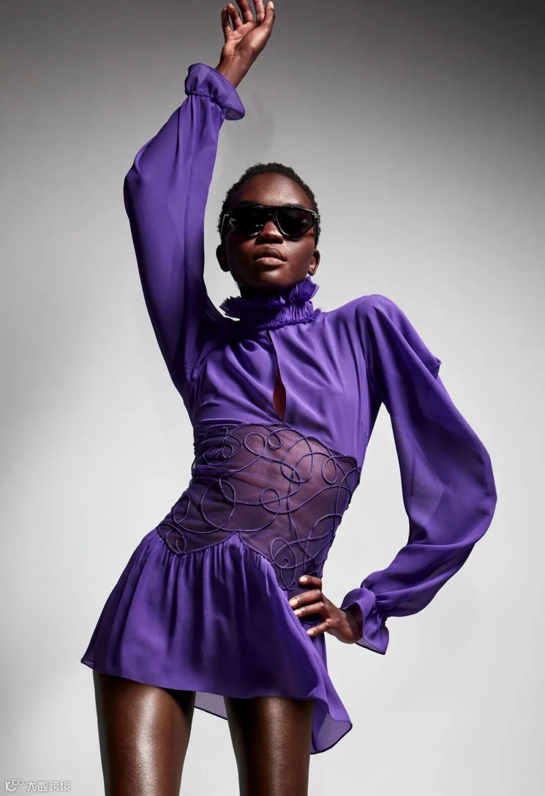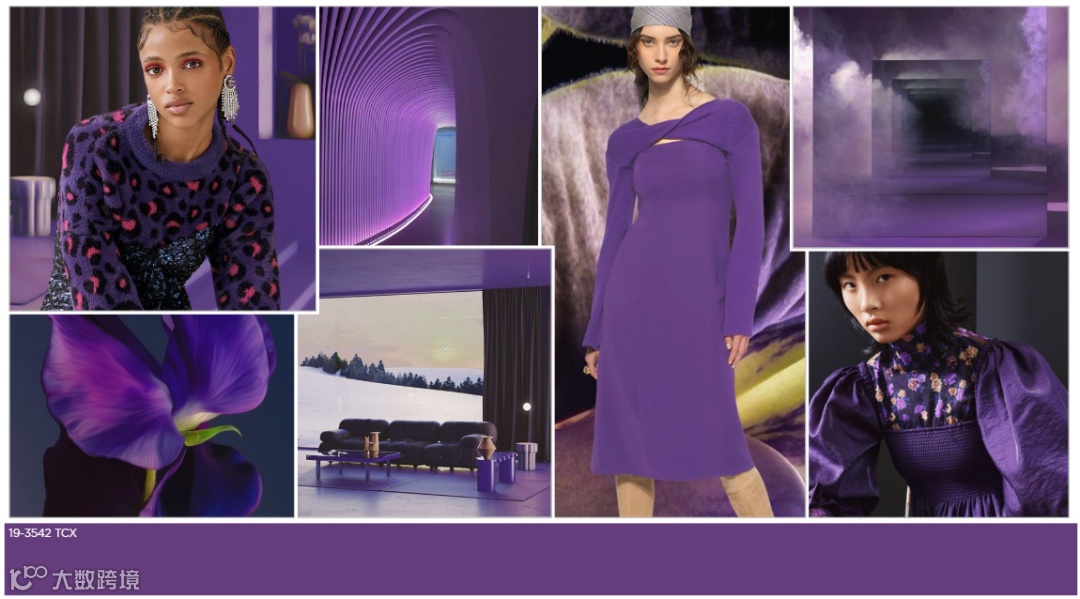 紫罗兰紫色:既感觉神秘又豪华,是带着颓废感的宝石色调,在情感上是一种逃避主义情绪的色彩。用在2022/23秋冬年轻的女装设计上,重要性日益提升,同时为新设计提供了一种更实用的替代色,相比令人着迷的传统洋红色,紫罗兰紫色是一种更时尚的用色。作为一个坚实的明亮色彩多应用于豪华的假日品类时装,也可作为印花面料的基色。可用于梭织上衣、连衣裙、毛衣等单品的设计中。