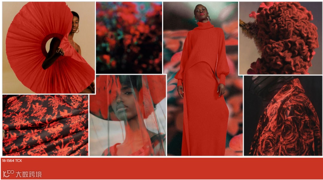 凤凰木红色:红色作为“情绪助推器”的刺激人眼球的色彩回归,凤凰木花红色邪恶的活力体现了力量和新的能量。在对积极和乐观的渴望驱使下,凤凰木红是本季最重要的红色,具有强烈的商业吸引力,贯穿于大多数品类的设计中。从有纹理的针织品到梭织装再到天鹅绒单品,本季各种面料都采用有强烈刺激人眼球的色调。考虑打造一个鲜明对比的色彩故事,或者将这种色彩注入你的节日礼物中。连衣裙,外套,西装,衬衫,毛衣都非常适合。
