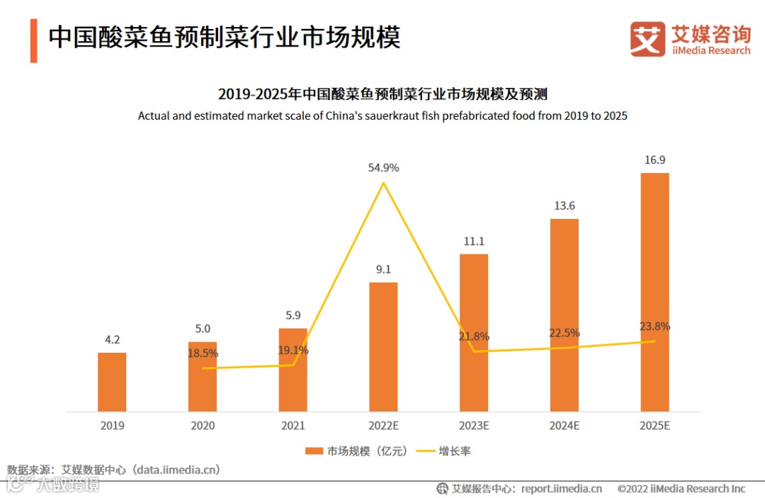 近年来,由于餐饮连锁化率不断提升,叠加“懒宅经济”、疫情等的影响,预制菜的热度大幅度上升,iiMedia Research(艾媒咨询)数据显示,2021年中国酸菜鱼预制菜市场规模为5.9亿元,预计2025年达16.9亿元。