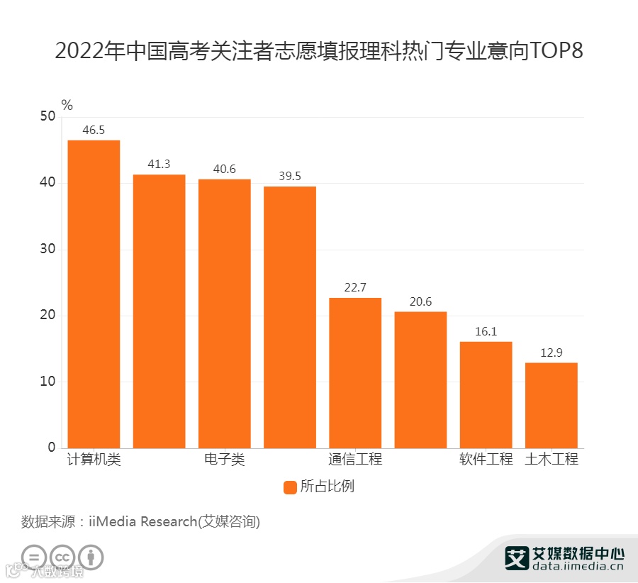 数据显示,个人兴趣是中国考生选择专业时首要考虑因素,占比为61.5%,其次分别为是否为热门专业(58.8%)和专业就业前景及薪资(40.6%)。艾媒咨询分析师认为,受访者缺乏报考专业认知和未来职业发展的规划能力,无法辨别个人兴趣专业和热门专业的未来发展前景,因此需要综合考量专业发展机遇。
