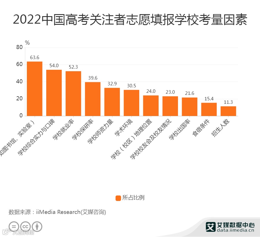 数据显示,2022年中国考生高考志愿填报学校前三考量因素分别是教学条件(63.6%)、学校综合实力(54.0%)、学校就业率(52.3%)。艾媒咨询分析师认为,大学丰富的教学资源为考生提供良好的教育基础,利于学生未来个人综合能力的发展,是受访者首要考量因素。