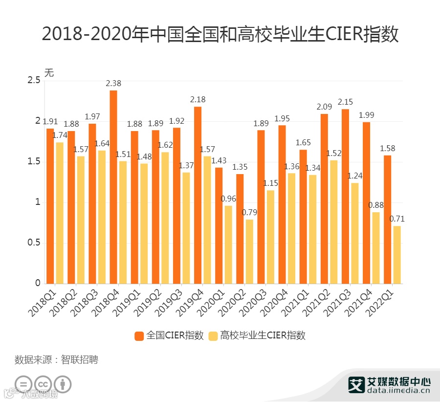 iiMedia Research(艾媒咨询)最新发布的《2022年中国高考志愿填报及就业前景大数据分析报告》数据显示,2022年第一季度高校毕业生CIER指数为0.71,降至2020年疫情暴发以来最低点,明显低于全国1.56的水平,高校市场一季度就业竞争激烈。受疫情和产业转型影响,企业缩减招聘规模,而庞大的毕业生群体今年就业形势较为严峻。